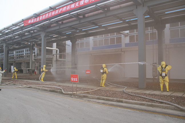 只見噴淋洗消裝置在值長的指示下及時開啟??傊笓]接到報告后立即指示啟動氯氣泄漏應(yīng)急預(yù)案,并通知公司防護專業(yè)分隊至泄漏區(qū)進行搶險救援。隨著現(xiàn)場氯氣的擴散,氯堿事業(yè)部的SIS系統(tǒng)自動啟動,液氯泄漏區(qū)的廠房全部自動關(guān)閉,氯氣吸收系統(tǒng)自動啟動,將泄漏的氯氣封閉在廠房內(nèi),防止氯氣向外擴散。公司對重大危險源管控的工程措施在此刻發(fā)揮了重要作用,為應(yīng)急堵漏贏得了時間。演練中,參演人員各司其職,現(xiàn)場加強警戒進行標示,及時疏散人員,快速處置氯氣泄漏,緊急搶救中毒人員,時刻監(jiān)測周邊環(huán)境……